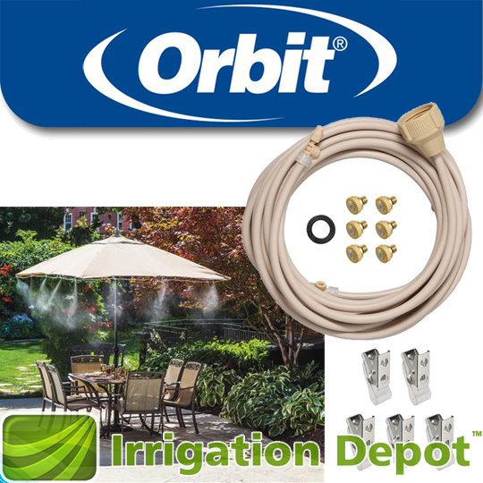The 12-Foot Portable Mist Cooling Kit provides relief from the heat wherever you need it. This preassembled kit provides 12 feet of mist cooling, dropping the surrounding air temperatures by up to 20 degrees Fahrenheit. Simply attach the convenient alligator clips to an umbrella, awning, fence or other structure and then connect to a standard garden hose to immediately experience the benefit of mist cooling. Includes: (20 ft.) Preassembled ¼ in. Flexible Tubing (8 ft. of feed line connected to 12 ft. of mist line), (6) Brass and stainless steel mist nozzles, (1) Hose Washer, (5) Hanging Snap Clips